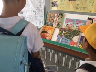 玄関に図書担当のM先生が、「本の帯コンクール」の課題図書と作り方の説明などを展示してくれています。本の帯には、その本のおすすめポイントや、キーワードなどを書いて、たくさんの人に読んでもらえるようにするためのものです。低学年、中学年、高学年別に課題図書があります。