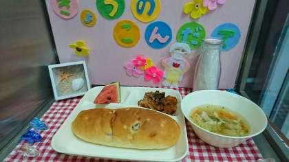 今日の献立は、かぼちゃのミートグラタン、スープ、すいか、おさつパン、牛乳でした。
