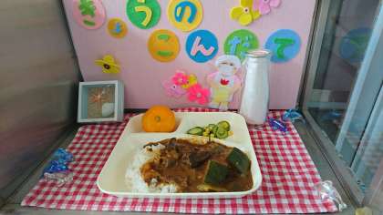 かぼちゃ、なす、トマト、ピーマン、セロリーなどの夏野菜がたっぷり入ったカレーは、子どもたちにも大人気でした。サラダにもきゅうりとコーンを使い、とても夏らしい献立でした。