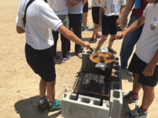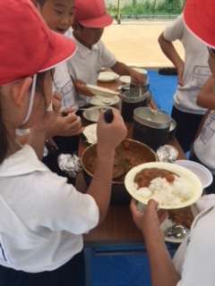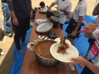 具がやわらかく煮えたので、カレールーを入れて混ぜると出来上がり!!飯盒で炊いたご飯もほとんど焦げることなく上手に出来上がりました。