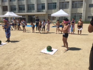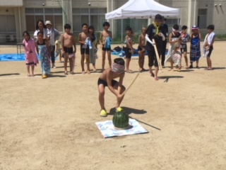 プールの後は、楽しみにしていたスイカ割り。「右、右!」「もうちょっと進んで!」などの声援を受けながら、スイカを割りました。