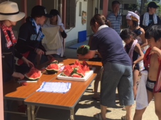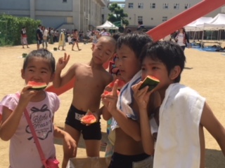 割れたスイカはお母さん達が、上手に切り分けてくださり、みんなでかぶりつきました!甘くて冷たくて、暑い今日にはぴったり!