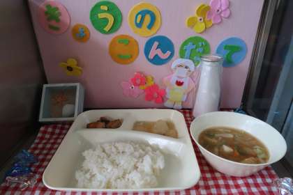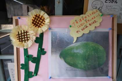 夏が旬の野菜ですが、冬まで保存がきくことから、冬瓜と呼ばれています。夏の水分補給にとてもよい食材です。給食室には大きなとうがんが届きました。調理員さんが、こどもたちにもとうがんの大きさが伝わるように、掲示してくれましたよ。