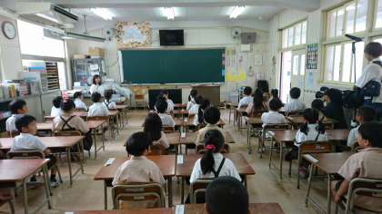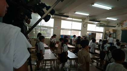 今日は1学期の終業式。朝から気温が高く、急遽放送による終業式を行いました。テレビ局や新聞社の取材が入り、少し緊張気味でしたが、しっかり話を聞くことができました。