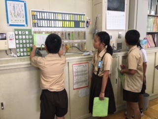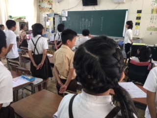校長先生の話の後、5年生が1学期を振り返ってがんばったことや心に残ったこと、夏休み頑張りたいことなどを発表しました。生活指導の先生からの注意の後、みんなで校歌を歌って終了しました。