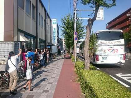 出発式のあと、城北公園通りまで移動してバスに乗り込みました。子どもたちのワクワクした表情を見ながら、出発するバスを見送りました。保護者のみなさま、早朝よりのお見送り、ありがとうございました。