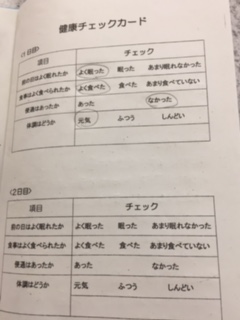 自分でしおりに記入して先生に点検してもらいます。体調が思わしくなければこの後の登山は、宿舎前での活動にしたいと考えています。