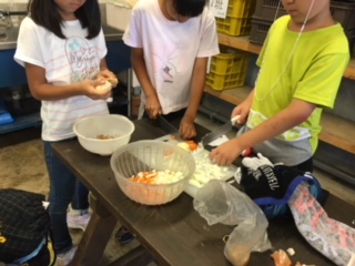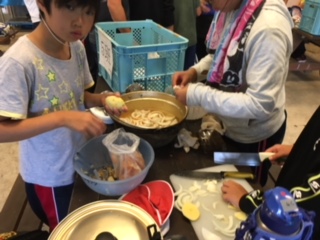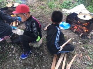 かまどで火起こしする係と野菜を切る係に分かれて準備です。