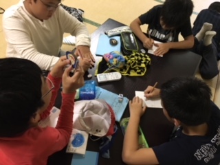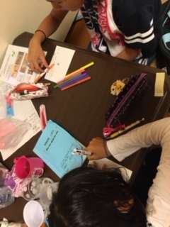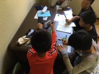 お風呂から上がって少しの時間を使って2日間の楽しい思い出をいっぱい絵や文で家族に知らせたいとハガキを書いています。
