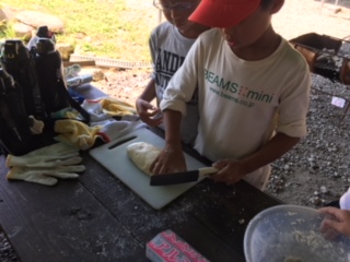 どうすればこねた生地を5等分できるか、考えました。いきた算数の力?!円を分けたり、棒状にして分けたり、班それぞれで切り分けました。