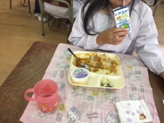今日から給食が始まりました。久しぶりの給食、今日はカレーでした。そして今日から牛乳が、瓶から紙パックになりました!同じメーカーですが、瓶の時より甘い味がする!と1年生。ほんとかな?