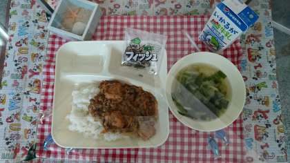 今日の献立は、マーボーあつあげ丼、中華スープ、ミニフィッシュ、牛乳でした。