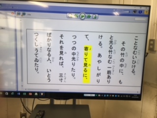 デジタル教科書、デイジー教科書を使って「古典に親しもう」の学習をO先生が授業公開しました。デイジー教科書は、読んでいるところに色が付き、音声も出ます。ゆっくり何度も読む練習をしました。また、デジタル教科書では、昔の読み方の音声(つがとぅと発音するなど)も聞くことができ、日本語が、変わっていっていることを知りました。放課後討議会を開き、成果と課題を明らかにしました。他学年に汎用できることも多いので、デジタル、デイジー教科書の活用を考えていく予定です。