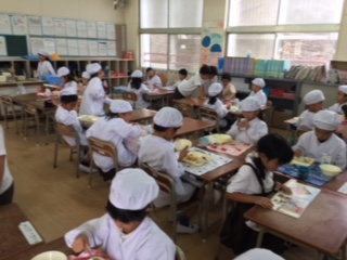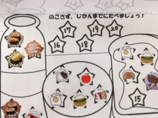 1年生の教室を覗くとお皿を見せにきたり、牛乳パックを持ってきたりして、「全部食べたよ!美味しかった!!」と報告してくれました。時間内に食べ終えたら、シールを貼って、自分の励みにしているようです。