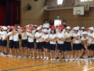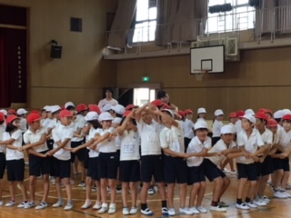 運動会ダンスの練習していました。よく見ると、円になってウェーブを作っています。手の組み方、タイミングなどなかなか難しい事に挑戦しています!