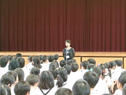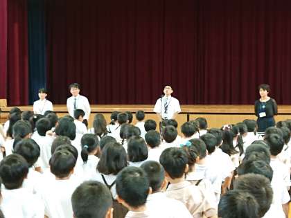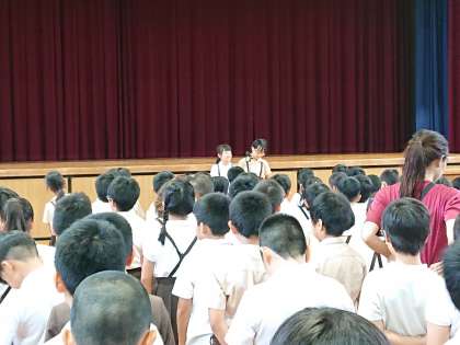 講堂で朝会を行いました。今日から2週間、教育実習生3名が子どもたちと活動します。子どもたちは新しい出会いに心ときめかせ、新鮮な気持ちでいたようです。