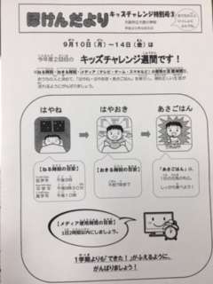 今週は、「はやね・はやおき・朝ごはん」と「メデイア使用時間」を自分で決め、規則正しい生活を送ることができるように挑戦しています。1学期のチャレンジ週間では、朝ごはんはほぼ全員がきちんと食べて登校できていました。早寝がなかなか難しかったようです。運動会の練習もあり、疲れも出やすいと思います。しっかり体を休めて元気で1日を過ごすことができるよう頑張りましょう。