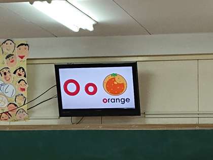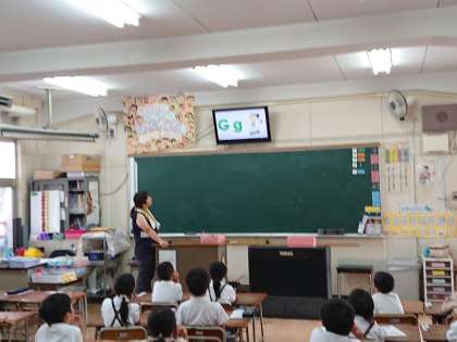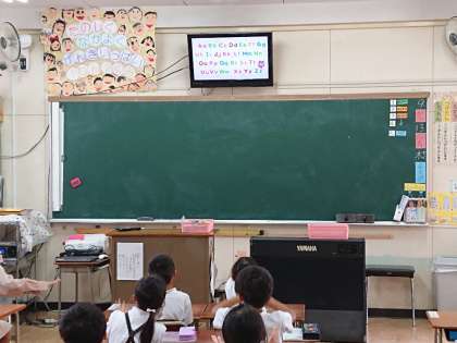 5時間目の前に、1年生の教室でも10分ほどの英語タイムを行っています。発音をしっかり聴き取って、真似をして発音したり、アルファベットに親しんだりしています。もちろん意味が分からないことも多いですが、低学年から英語のシャワーをたくさん浴びることがとても大事な経験となっています。