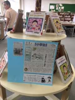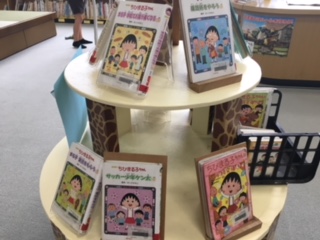 先日「ちびまる子ちゃん」の作者、さくらももこさんが亡くなりました。小学生新聞の記事とちびまる子ちゃんのシリーズ本を展示しています。アニメとはまた違ったおかしさ、楽しさ、作者のメッセージなどを感じ取ってくれたらうれしいです。