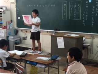 「たからものをしようかいしよう」の学習で、1人ずつ発表をしました。「たからものはお兄ちゃん」という子もいて「けんかせぇへんの?」と驚いている子もいました。