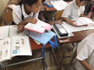 また、同音異義の言葉を辞書を使って調べる学習もしていました。辞書をよく使っています。付箋がたくさんついていました。