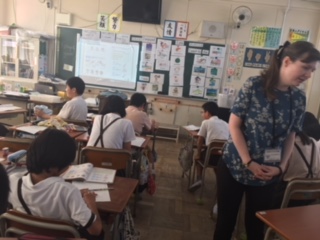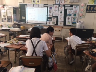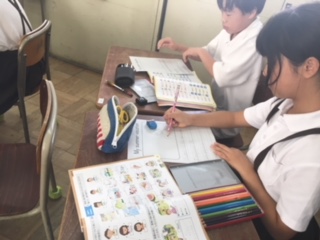 昨日の英語の時間です。夏休みの思い出を簡単な英語で表し、絵も描いて発表しました。I went to〜。I enjoyed〜など過去形での言い方です。