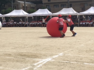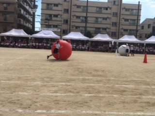 大きな玉を2人で協力して転がします。コーンを回るのが難しく思わぬ方向へ行ってしまいます!!