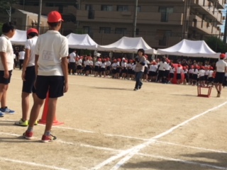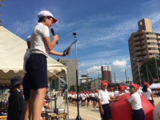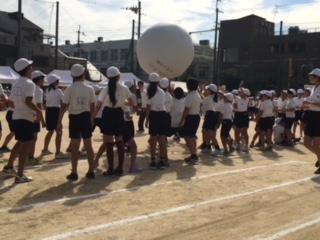 全校児童による大玉運びは、児童会が中心になって進行。全員で気持ちを一つにして転がしたり運んだりします。
