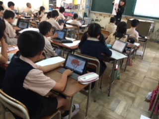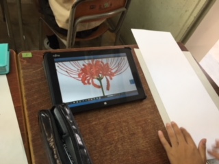 国語科で「ごんぎつね」の学習に入りました。ごんぎつねのお話の中には、彼岸花が出てきます。今日は、細い花びらが重なって美しく咲いている彼岸花を描きました。実物がなかったので、タブレットPCの写真をじっくり見ながら、細かくていねいに描いていきました。