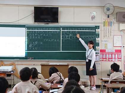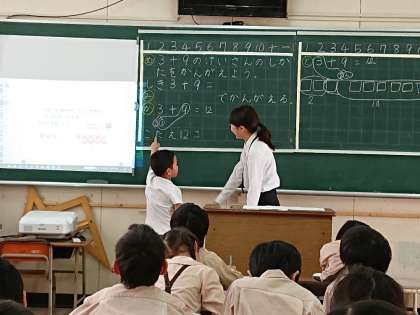 1年生の教室で実習生が研究授業を行いました。3+9の繰り上がりのある足し算で、どちらの数を分解して10を作るか考えました。先生たちが見守るなか、とても緊張していたと思いますが、学んだことを生かして授業を行っていました。