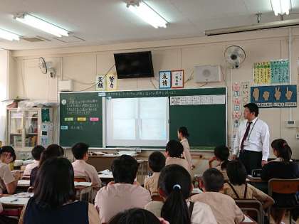 6年生の教室で、実習生が研究授業を行いました。算数の速さの問題です。速さが定まっている場合、時間と距離の関係を考えました。子どもたちはxとyの文字式と表を使い、時間と距離が比例の関係にあることを理解しました。