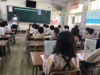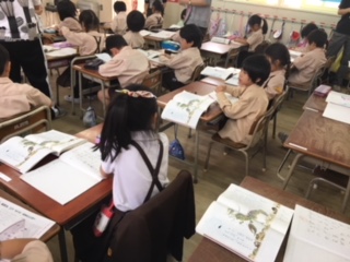 2組のK先生が、1組の子ども達に教えました。大きな声でしっかりと音読ができています。教科書に書いてある言葉や文と自分の経験、読書体験などを結びつけ、想像を広げました。お話が大好きな子ども達です。
