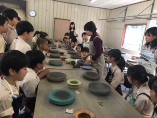 クラスごとに説明を聞いています。信楽の土は、粘りがあり、大変質の良いことで有名です。6年生で、陶芸体験経験者は少ないようです。さて、どんな作品ができるかな。