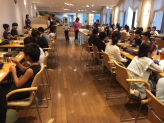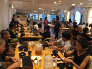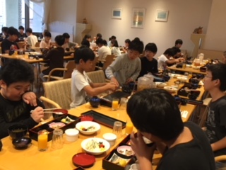 部屋の片付けなどが終わり班ごとに集合しました。楽しみの朝食です。