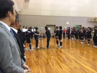 9じ10分より旭スポーツセンターで区PTAバレーボール大会開会式が始まりました。今年で12年目を迎えるそうです。昨年度準優勝した本校は、準優勝杯を返還しました。