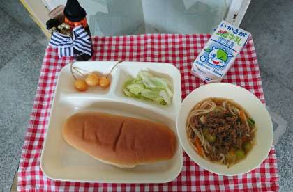 今日の献立は、タンタンメン、キャベツの甘酢づけ、さくらんぼ(缶詰)、黒糖パン、牛乳でした。