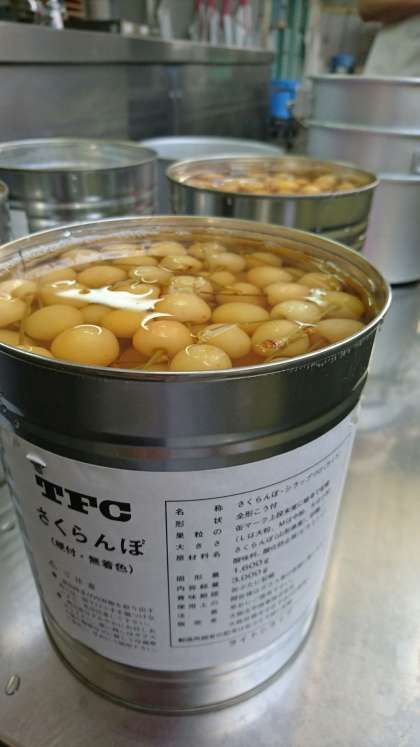 みなさんが見かける缶詰のさくらんぼは、赤い色をしていませんか?給食の缶詰のさくらんぼは、白っぽい黄色をしています。さくらんぼの缶詰は、生のさくらんぼを缶に詰めて熱処理をすると、生の時のピンク色が抜けて白っぽくなってしまいます。これに、赤い色を着色したものが売り出されているのですが、給食では、この着色する前のものを特別に仕入れて子どもたちに提供しています。