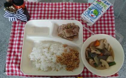 今日の献立は、豚肉のねぎじょうゆ焼き、ふきよせ煮、ツナ大豆そぼろ、米飯、牛乳でした。