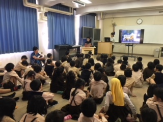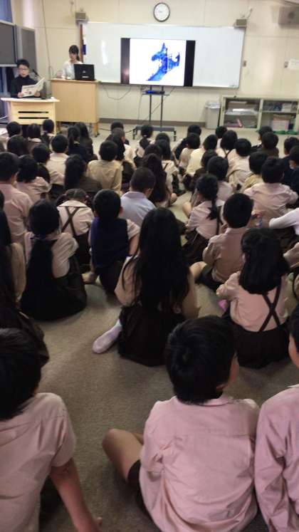 今日は午後から「がんばる先生支援事業」の発表会を行いました。それに先立ち、午前中、講師でフリーアナウンサーのK先生が、授業をしてくださいました。「ライオンはしった」「魔女のほうき」を挿絵を拡大して読んでくださいました。間に声の出し方の練習も教えていただきました。