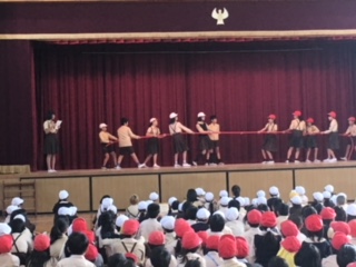 続いて大宮スポーツ大会の説明です。代表委員会として初めての仕事です。みんなにルール説明をしました。スポーツ大会は、短い縄での綱引きを縦割りグループ対抗で行います。