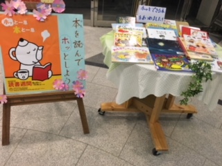 27日から読書週間が、スタートします。それに先立ち、玄関には「ホッとする本」が展示してあります。今年の読書週間のテーマは、「ホッと一息、本と一息」です。