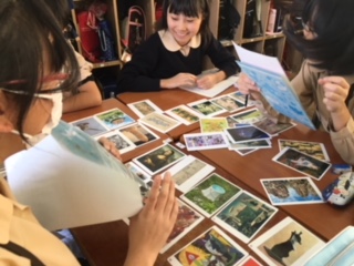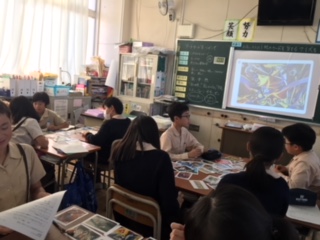 有名な絵画、ポスターなどのミニカードを使って、自分が感じた印象を短い言葉で表現して、それがどの絵なのかグループであて合いをしました。同じ絵を見ても人によって感じ方は違いますね。どんな風に感じるかは自由です。よく知っている絵もあれば初めて見るものもあり、楽しみながら鑑賞しました。