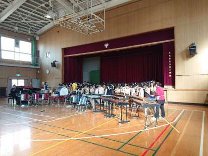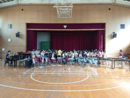 昨日から講堂で練習をしています。今日は、舞台の寸法通り広さを測って、立ち位置を決めました。100人以上の人数が舞台に立つので、かなり狭くなってしまいます。しかし、子どもたちのエンジンがかかってきました。歌声が響いてきました。心を込めて歌えるように、練習を重ねていきます。