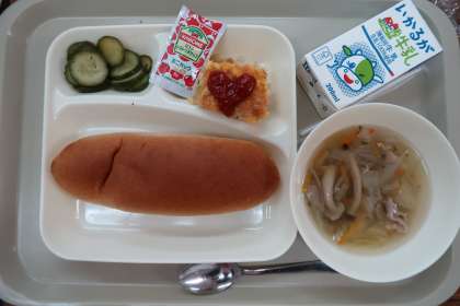 今日の献立は、ツナポテトオムレツ、スープ、きゅうりのバジル風味サラダ、黒糖パン、牛乳でした。