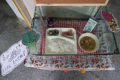 今日の献立は、、赤魚のしょうゆだれかけ、さつまいものみそ汁、こまつなのいためもの、ごはん、牛乳です。