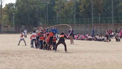 休憩の合間もみんなで練習をしていたジャンボ縄跳び合戦。みんなの気持ちがそろっています!