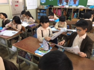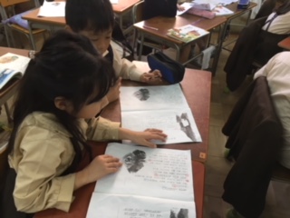 「かさこじぞう」の学習です。まず一人学びでじいさま・ばあさまの暮らしぶりがわかるところにサイドラインを引きました。それを隣同士で確かめ合いました。なぜそこに線を引いたのか、どんな暮らしぶりがわかるのか、自分と同じところ、違うところを見つけていきました。比較したり理由付けをしたりする活動は、思考力を高めることに繋がります。