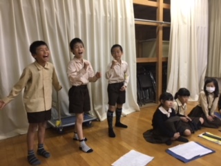 4年生は、国語科で学習した「こわれた千の楽器」の音楽劇を学習発表会で披露します。キッズルームでの練習は、元気があり、ユーモアもあって、なかなか芸達者の集まりを感じさせます。