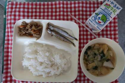 今日の献立は、焼きししゃも、五目汁、きんぴらごぼう、ごはん、牛乳でした。