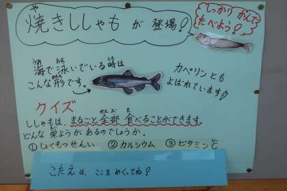 給食に使用したのは、子持ちのカラフトシシャモ(カペリン)と呼ばれる魚です。「ししゃも苦手」と言う児童もいましたが、「おなかの中にたくさんの小さな卵があるよ。」と話して半分に切ってみるように促すと、「これ全部卵!?」と驚いたり、食べず嫌いの子は卵だけ食べてみたりと、チャレンジする姿がみられました。「ししゃものお母さんのあかちゃんなんだね」と話して食べてみる子もいました。
